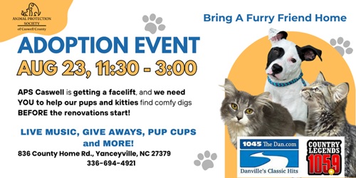 It’s an Adoption paw-ty you won’t want to miss—with music, fun and wagging tails. The Dan 104.5 and Country Legends Radio will be broadcasting live at the Shelter at 836 Country Home Road in Yanceyville, so bring your friends, and your family!